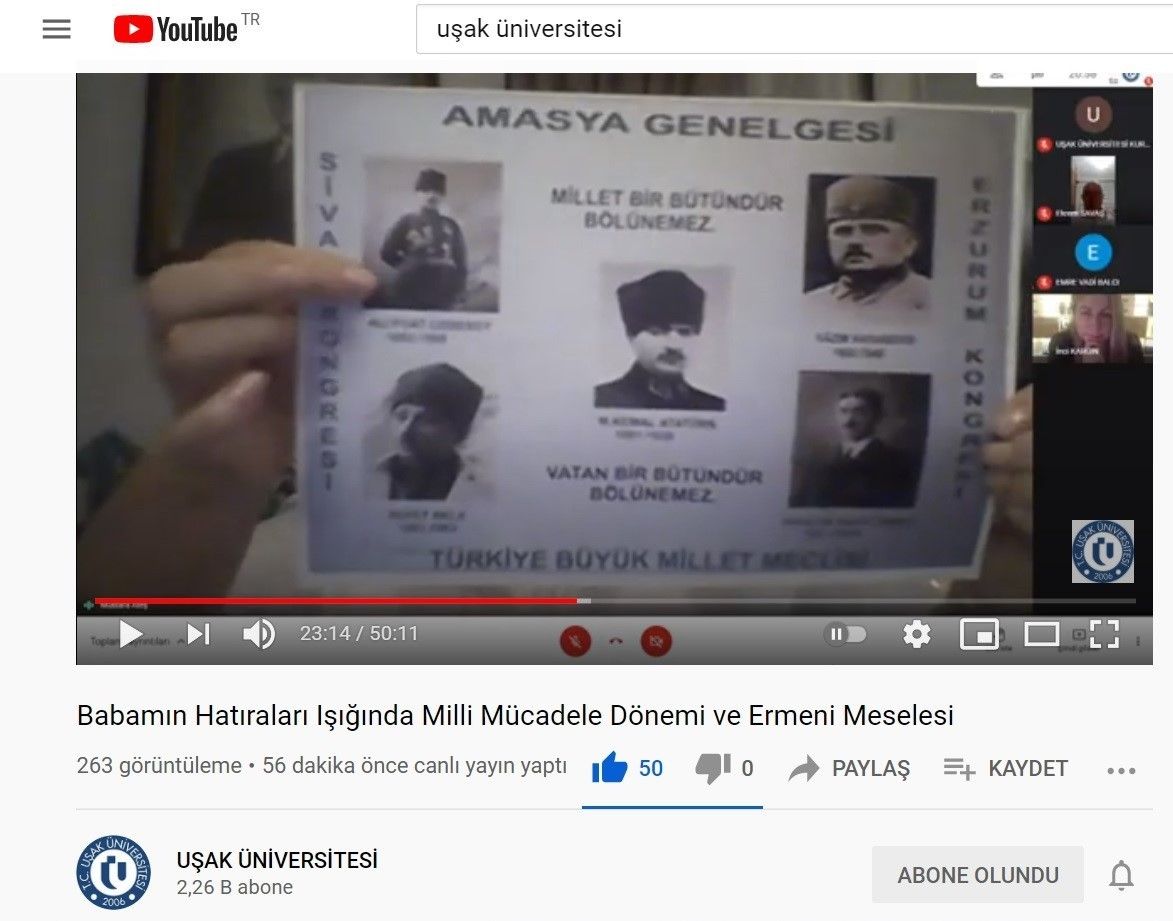 Uşak Üniversitesi Göç Araştırmaları ve Siyaset Uygulama ve Araştırma Merkezi tarafından; Doğu Cephesi Komutanı General Kazım Karabekir'in kızı Timsal Karabekir'in konuşmacı olarak yer aldığı "Babamın Hatıraları Işığında Milli Mücadele Dönemi ve Ermeni Meselesi" adlı çevrimiçi etkinlik gerçekleştirildi. Moderatörlüğünü Göç Araştırmaları ve Siyaset Uygulama ve Araştırma Merkezi Müdürü Dr. Öğretim Üyesi İnci Aksu Kargın'ın yaptığı etkinlik, Uşak Üniversitesi YouTube kanalından canlı yayınlandı.