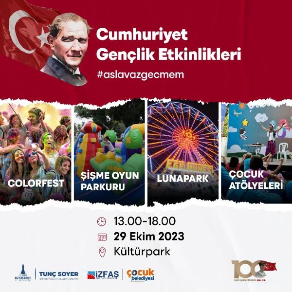 İzmir Büyükşehir Belediyesi, Cumhuriyetimizin 100. yılını gurur ve coşkuyla kutlamak için şehrin dört bir yanında özel etkinlikler düzenliyor. 7'den 77'ye İzmirliler, Cumhuriyetimizin 100. yılını 'Cumhuriyet Gençlik Etkinlikleri' ile Kültürpark'ta hep birlikte kutlayacak. 29 Ekim'de saat 13:00'te başlayacak Cumhuriyet Gençlik Etkinlikleri, Kültürpark'ta gerçekleştirilecek. Kutlamaların önemli bir ayağı olarak; yapay zeka sayesinde Türkiye Cumhuriyetinin kurucusu Ulu Önder Mustafa Kemal Atatürk ile fotoğraf çekilmek mümkün olacak. Gençler ve çocuklar için farklı oyun alanları, zipline ile macera parkurundan farklı alanlarda atölyelere, Cumhuriyet temalı bilgi yarışmasından rengarenk boyalarla yapılacak Colour Fest'e kadar birçok etkinlik düzenlenecek. Çocuklar, ayrıca, lunaparkta da İzmir Büyükşehir Belediyesi organizasyonuyla keyifli dakikalar geçirecek. Etkinlikler, Cumhuriyetin 100. yıl kutlamalarının unutulmaz bir parçası olacak.