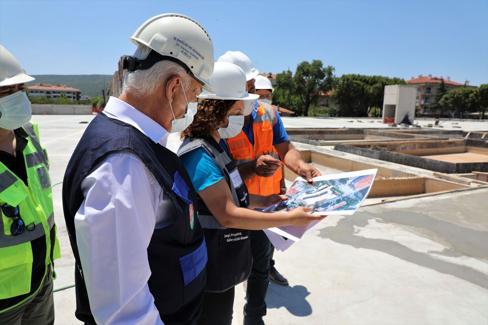 Muğla Büyükşehir Belediye Başkanı Dr. Osman Gürün yapımı devam eden Kent Meydanı inşaatında incelemelerde bulunurken yüklenici firma yetkililerinden bilgi aldı.