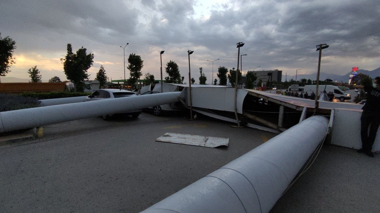 Denizli'de etkili olan fırtına sonrası bir işyerine ait totem otoparkta bulunan araçların üzerine devrildi. Bir araç ise devrilen totemin iki ayağının arasında kalarak kıl payı zarar görmedi.