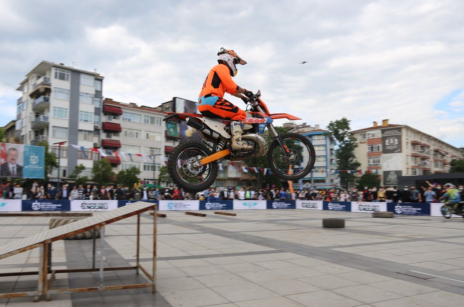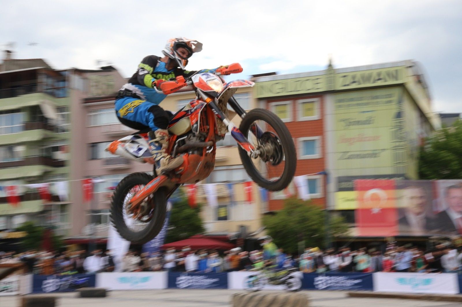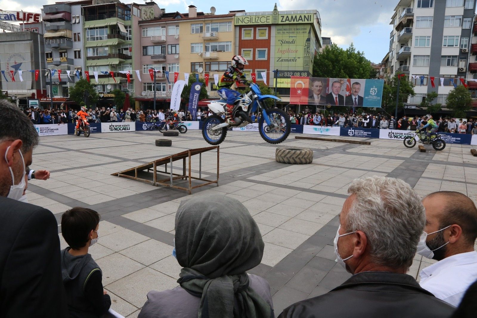 Kocaeli'de, hafta sonu düzenlenecek Türkiye Süper Enduro Şampiyonası öncesinde sporcuların kent merkezinde yaptıkları gösteri nefesleri kesti.