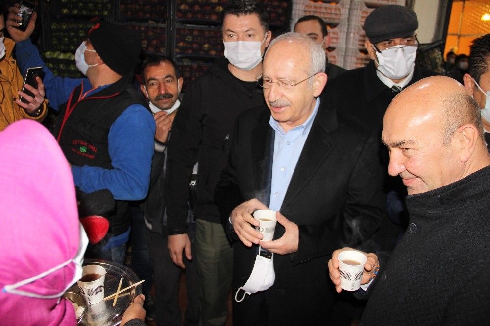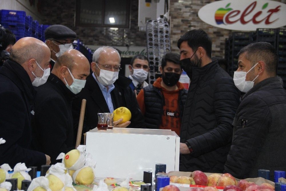 CHP Genel Başkanı Kemal Kılıçdaroğlu, İzmir Buca'da bulunan meyve ve sebze halini ziyaret ederek esnafların sorunlarını dinledi, ardından da toplantı düzenledi.