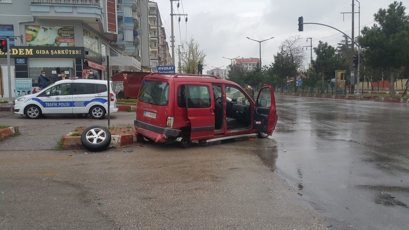 Afyonkarahisar'da sokağa çıkma kısıtlamasında hafif ticari araç ile otomobil kavşakta bir birine girerken, kazada ticari aracın tekerleklerinden biri kopması ise kazanın şiddetini gözler önüne serdi.