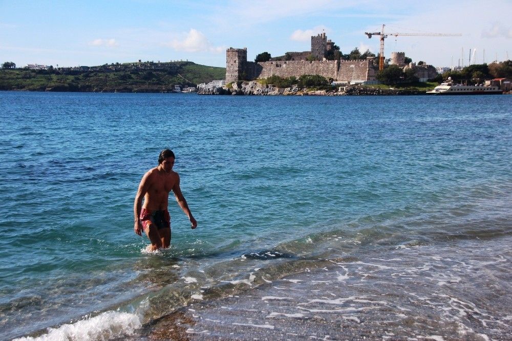 Bodrum'da 2 gündür etkili olan fırtına, sağanak yağış ve dolunun ardından açan güneşi fırsat bilen bir genç, kısıtlamaya rağmen denize girdi, bazı vatandaşlar ise balık tuttu. Bir grup gencin de sokağa çıkma kısıtlamasına aldırmadan eğlenmesi dikkatlerden kaçmadı.