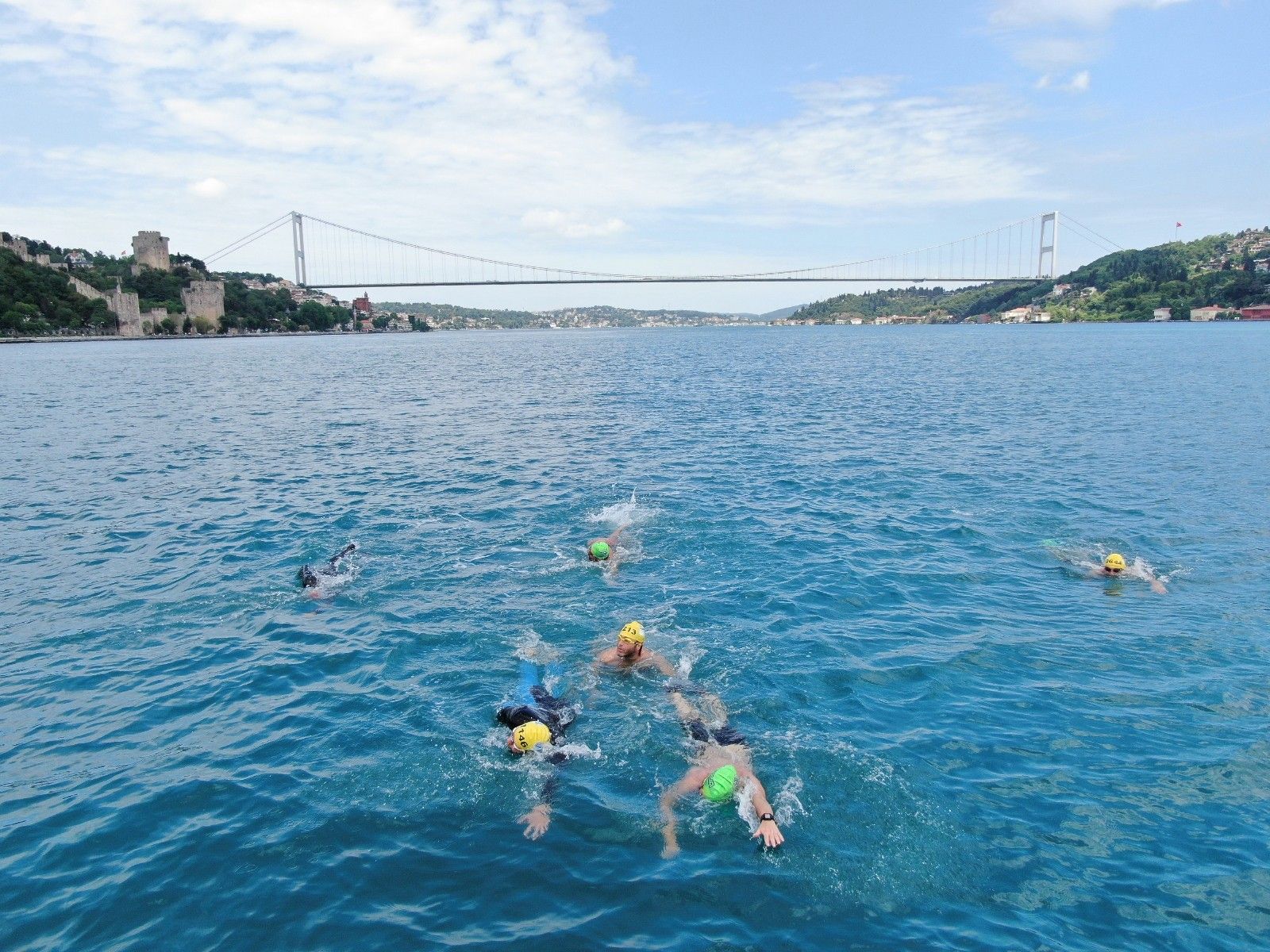 Hafta sonu sokağa çıkma kısıtlamasında bir grup profesyonel yüzücü Boğaz'dan yüzerek karşıya geçti. Rumeli Hisarı Sahilinden denize giren yüzücüler havadan görüntülendi.