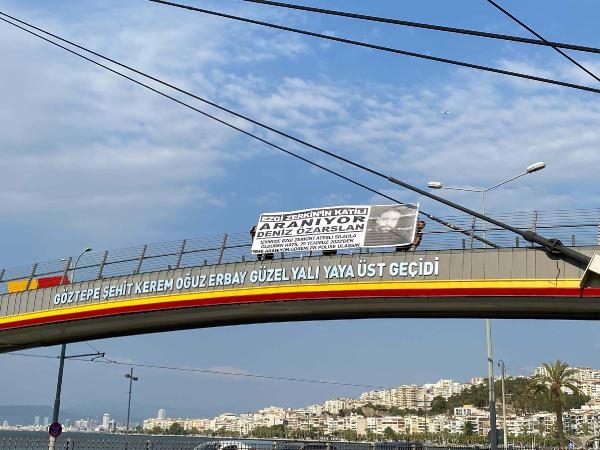 İzmir'de, geçen yıl boşanma aşamasındaki eşi Ezgi Zerkin'i (31) tabancayla öldürüp kaçan Deniz Özarslan (36), 382 gün geçmesine rağmen yakalanamadı. Ezgi Zerkin'in defnedilmesinin yıl dönümünde ailesi, Şehit Kerem Oğuz Erbay Güzelyalı Üst Geçidi'ne 'İzmir'de Ezgi Zerkin'i ateşli silahla öldüren katil zanlısı 29 Temmuz 2022'den beri aranıyor. Görenler polise ulaşsın' yazılı pankart astı.