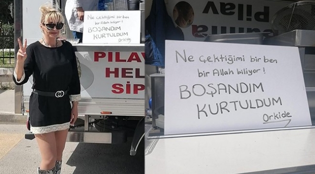 İzmirli siyasetçi Orkide Peksev, 2 yıllık evliliğinin bitmesini lokma dökerek kutladı. Lokma arabasının önünde poz veren Peksev, bir karton üzerine ''Ne çektiğimi bir ben bir Allah biliyor! Boşandım kurtuldum'' şeklinde yazı yazdı.