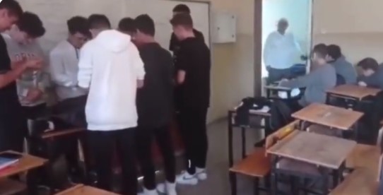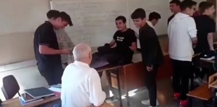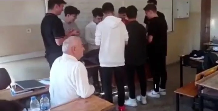 Sela sesi açan öğrenciler, sıraya yatırdıkları arkadaşlarının önünde saf tuttu. Öğretmenin sınıfa girmesiyle birlikte öğrenciler "Nasıl bilirdiniz, hakkınızı helal ediyor musunuz" dedi.