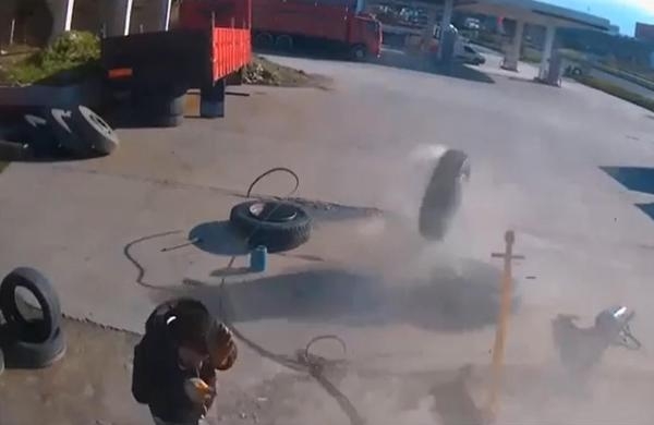 Olay, dün öğle saatlerinde, Turgutlu ilçesi Manisa- Turgutlu kavşağında meydana geldi. Lastik tamircisi Celal İvdi, değişim için tamirhaneye getirilen yeni kamyon lastiğini eskisiyle değiştirdikten sonra, kompresörle hava basmaya başladı. Bu sırada lastik, gürültüyle patladı. Lastik yerden yaklaşık 1 metre yükseğe fırlarken, İvdi, büyük korku yaşadı. O anlar, iş yerinin güvenlik kameralarına yansıdı.