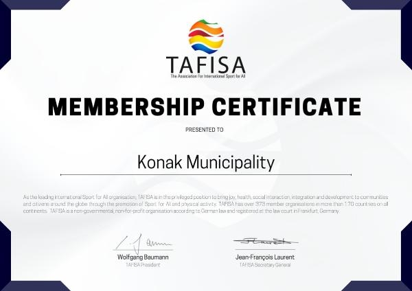 The Association For International Sport for All (TAFISA - Uluslararası Herkes İçin Spor Derneği) tarafından Slovenya'nın Portoroz kentinde yapılan genel kurul toplantısında Konak Belediyesi'nin tam üyeliği kabul edildi. 1991'den bu yana faaliyette olan ve herkes için sporu destekleyen kuruluşun, 27'nci genel kurulunda aldığı karar ile Türkiye'de 2022 yılında üyeliği kabul edilen tek kurum ve yerel yönetim Konak Belediyesi oldu. TAFISA üyeliğiyle uluslararası alanda adını spor ve aktif yaşam ile duyurma şansı yakalayan Konak Belediyesi, aynı zamanda tüm dünyada TAFISA üyesi ülke ve şehirler tarafından kutlanan World Challenge Day (Dünya Hareketsizliğe Karşı Mücadele Günü), World Walking Day (Dünya Yürüyüş Günü), TAFISA Misyonu 2030 Çalıştayları, Aktif Şehirler girişimleri, Geleneksel Spor ve Oyun girişimleri gibi faaliyetlerle birlikte TAFISA Dünya Kongrelerine, Dünya ve Bölgesel Spor faaliyetlerine katılma hakkını da elde etti.