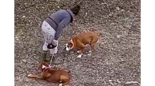 Biri tasmalı iki köpeğini eline aldığı sopayla döven kadın, ifadesi alınmak üzere polis merkezine götürüldü. Köpeklerini kediye saldırdığı için dövdüğünü savunan kadına mala zarar verme suçundan adli işlem yapıldı.
