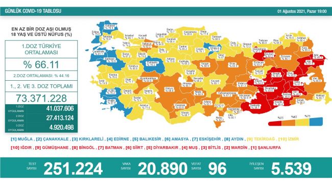 Sağlık Bakanlığı tarafından Türkiye'nin yeni korona virüs tablosu açıklandı. 1 Ağustos'ta açıklanan 24 saatlik verilere göre 20 bin 890 vaka tespit edildi. Virüs nedeniyle hayatını kaybedenlerin sayısı 96 oldu. Son 1 günde toplam 251 bin 224 test yapılırken, iyileşen hasta sayısı 5 bin 539 olarak kaydedildi. Sağlık Bakanlığı tarafından açıklanan tabloda, aşılama verilerine de yer verildi. En az 1 doz aşı olmuş 18 yaş üzeri nüfusu kapsayan verilere göre Türkiye'de 1. doz aşılama ortalama yüzde 66,11 oldu. 2. doz ortalaması yüzde 44,16 olurken, 1., 2. ve 3. doz aşısını olan vatandaş sayısı toplamda 73 milyon 371 bin 228'e yükseldi.