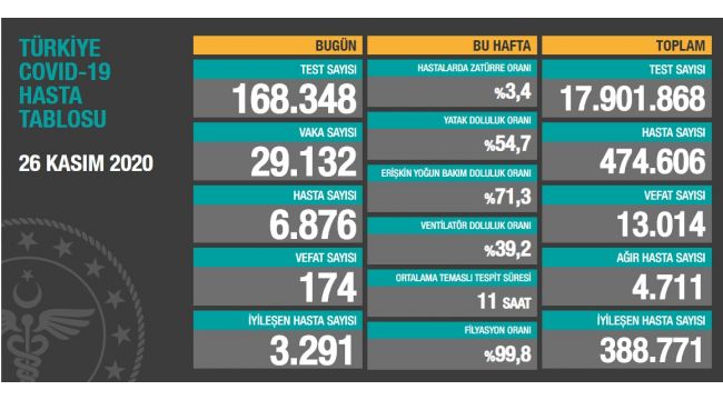 Sağlık Bakanlığının Covid-19 bilgilendirme sayfasında Türkiye'nin güncel korona virüs tablosu kamuoyuyla paylaşıldı. Tabloya göre son 24 saatte 174 kişi korona virüsten hayatını kaybetti, toplam can kaybı 13 bin 14'e yükseldi. Bugün toplam 168 bin 348 test yapılırken, 29 bin 132 yeni vaka sayısı, 6 bin 876 kişinin de hastaneye yatan vaka oldu. Toplam vaka sayısının 474 bin 606 olduğu, bugün iyileşen 3 bin 291 kişiyle birlikte toplam iyileşen hasta sayısının 388 bin 771'e yükseldiği, toplam hastalarda zatürre oranının yüzde 3,4, toplam ağır hasta sayısının ise 4 bin 711 olduğu açıklandı.