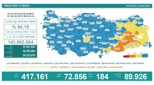 Buna göre; Türkiye'de son 24 saatte 414 bin 161 Kovid-19 testi yapıldı, 72 bin 856 kişinin testi pozitif çıkarken, 184 kişi ise hayatını kaybetti.
