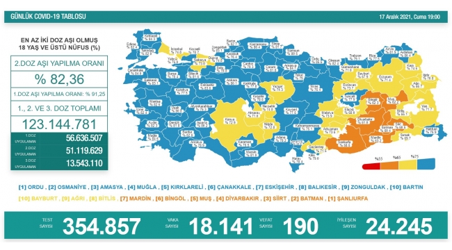 Sağlık Bakanlığı tarafından açıklanan 17 Aralık koronavirüs tablosuna göre; son 24 saatte 18 bin 141 yeni vaka tespit edilirken, 190 kişi hayatını kaybetti. Tabloda dünkü verilere göre hem vaka hem de vefat sayısında düşüş yaşanması dikkat çekti.