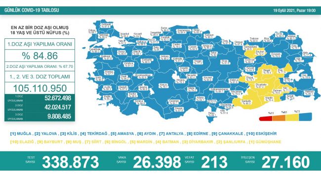 Sağlık Bakanlığı tarafından Türkiye'nin yeni korona virüs tablosu açıklandı. 19 Eylül'de açıklanan 24 saatlik verilere göre 26 bin 398 vaka tespit edildi. Virüs nedeniyle hayatını kaybedenlerin sayısı 213 oldu. Bir günde toplam 338 bin 873 test yapılırken, iyileşen hasta sayısı 27 bin 160 olarak kaydedildi. Sağlık Bakanlığı tarafından açıklanan tabloda, aşılama verilerine de yer verildi. En az 1 doz aşı olmuş 18 yaş üzeri nüfusu kapsayan verilere göre Türkiye'de 1. doz aşılama ortalama yüzde 84,86 oldu. 2. doz ortalaması yüzde 67,70 olurken, 1., 2. ve 3. doz aşısını olan vatandaş sayısı toplamda 105 milyon 110 bin 950'ye yükseldi.