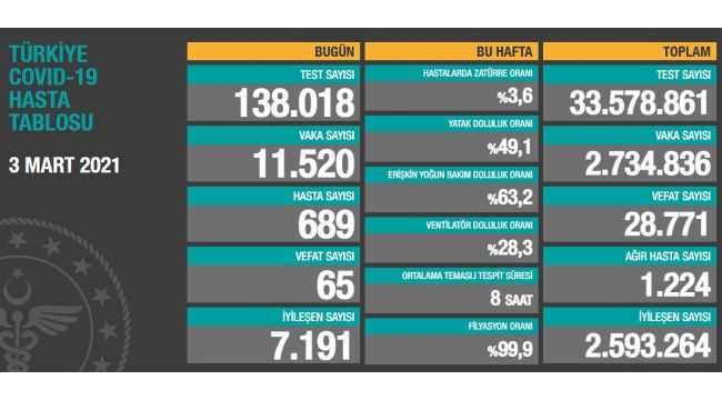 Sağlık Bakanlığının Covid-19 bilgilendirme sayfasında Türkiye'nin güncel korona virüs tablosu kamuoyuyla paylaşıldı. Tabloya göre son 24 saatte 65 kişi korona virüsten hayatını kaybetti, toplam can kaybı 28 bin 771'e yükseldi. Toplamda 33 milyon 578 bin 861 test yapıldı. Bugün yapılan 138 bin 18 testten, 11 bin 520 yeni vaka sayısı, 689 de yeni hasta sayısı olduğu belirtildi. Toplam vaka sayısının 2 milyon 734 bin 836 olduğu, bugün iyileşen 7 bin 191 kişiyle birlikte toplam iyileşen hasta sayısının 2 milyon 593 bin 264'e yükseldiği, toplam hastalarda zatürre oranının yüzde 3,6, ağır hasta sayısının ise bin 224 olduğu açıklandı.