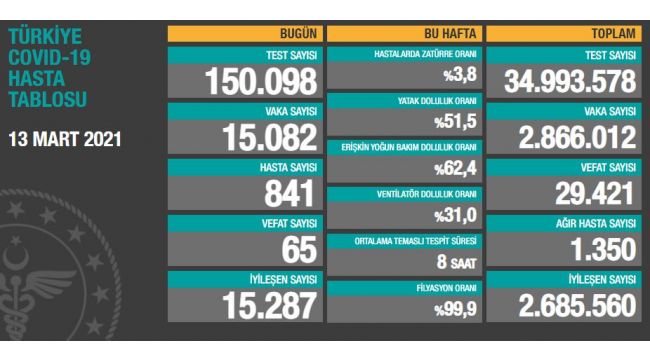 Sağlık Bakanlığının Covid-19 bilgilendirme sayfasında Türkiye'nin güncel korona virüs tablosu kamuoyuyla paylaşıldı. Tabloya göre son 24 saatte 65 kişi korona virüsten hayatını kaybetti, toplam can kaybı 29 bin 421'e yükseldi. Toplamda 34 milyon 993 bin 578 test yapıldı. Bugün yapılan 129 bin 299, 11 bin 187 yeni vaka sayısı, 841 de yeni hasta sayısı olduğu belirtildi. Toplam vaka sayısının 2 milyon 886 bin 12, bugün iyileşen 15 bin 287 kişiyle toplam iyileşen hasta sayısının 2 milyon 685 bin 560'a yükseldiği, toplam hastalarda zatürre oranının yüzde 3,8, ağır hasta sayısının ise bin 350 olduğu açıklandı.