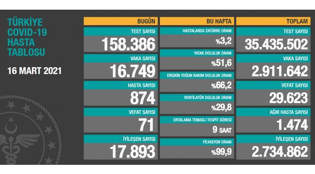 Sağlık Bakanlığının Covid-19 bilgilendirme sayfasında Türkiye'nin güncel korona virüs tablosu kamuoyuyla paylaşıldı. Tabloya göre son 24 saatte 71 kişi korona virüsten hayatını kaybetti, toplam can kaybı 29 bin 623'e yükseldi. Toplamda 35 milyon 435 bin 502 test yapıldı. Bugün yapılan 158 bin 386 testten, 16 bin 749 yeni vaka sayısı, 874 de yeni hasta sayısı olduğu belirtildi. Toplam vaka sayısının 2 milyon 911 bin 642 olduğu, bugün iyileşen 17 bin 893 kişiyle birlikte toplam iyileşen hasta sayısının 2 milyon 734 bin 862'a yükseldiği, toplam hastalarda zatürre oranının yüzde 3,2, ağır hasta sayısının ise bin 474 olduğu açıklandı.