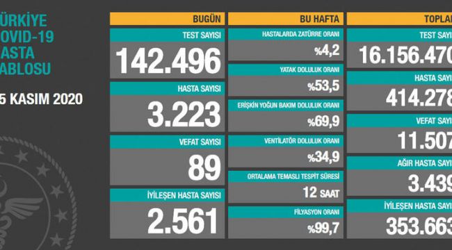 Sağlık Bakanlığı, Covid-19 bilgilendirme sayfasında Türkiye'deki güncel korona virüs tablosunu paylaştı. Tabloya göre son 24 saatte 89 kişi korona virüsten hayatını kaybederken, toplam can kaybı 11 bin 507'e yükseldi. Bugün toplam 142 bin 496 test yapılırken, 3 bin 223 kişiye de hasta tanısı konuldu. Bu rakamla beraber toplam hasta sayısı ise 414 bin 278 oldu. Bugün iyileşen 2 bin 561 kişiyle birlikte iyileşen toplam hasta sayısı 353 bin 663'ye yükseldi. Bu hafta hastalarda zatürre oranının yüzde 4.2, toplam ağır hasta sayısının ise 3 bin 439 olduğu açıklandı.