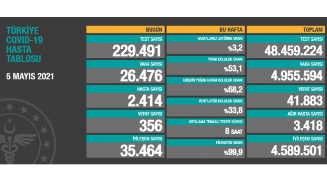 Sağlık Bakanlığının Covid-19 bilgilendirme sayfasında Türkiye'nin güncel korona virüs tablosu kamuoyuyla paylaşıldı. Tabloya göre son 24 saatte 356 kişi korona virüsten hayatını kaybetti, toplam can kaybı 41 bin 883'e yükseldi. Toplamda 48 milyon 459 bin 224 test yapıldı. Bugün yapılan 229 bin 491 testten, 26 bin 476 yeni vaka sayısı, 2 bin 414 kişi de yeni hasta sayısı olduğu belirtildi. Toplam vaka sayısının 4 milyon 955 bin 594 olduğu, bugün iyileşen 35 bin 464 kişiyle birlikte toplam iyileşen hasta sayısının 4 milyon 589 bin 501'e yükseldiği, toplam hastalarda zatürre oranının yüzde 3,2, ağır hasta sayısının ise 3 bin 418 olduğu açıklandı.
