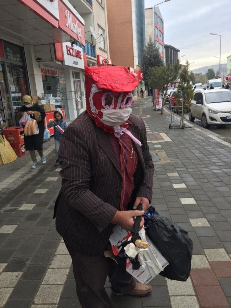 Yozgat'ta kendisine özel tasarladığı ilginç maskesiyle korona virüsünden korunduğunu söyleyen vatandaşı görenler şaşkınlığını gizleyemiyor.