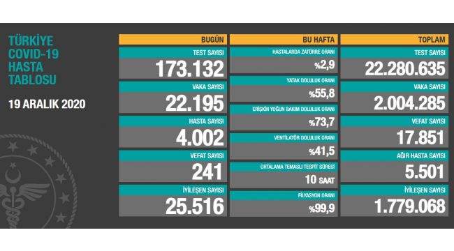 Sağlık Bakanlığı tarafından 20 Aralık koronavirüs tablosu, vaka, hasta, test, vefat sayısı ve son durum açıklandı.