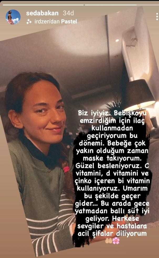 Sosyal medya hesabından paylaşım yapan Bakan, "Biz iyiyiz. Bebişkoyu emzirdiğim için ilaç kullanmadan geçiriyorum bu dönemi. Bebeğe çok yakın olduğum zaman maske takıyorum. Güzel besleniyoruz. C, D ve çinko içeren bir vitamin kullanıyoruz. Umarım bu şekilde geçer, gider. Bu arada gece yatmadan ballı süt iyi geliyor. Herkese sevgiler ve hastalara acil şifalar diliyorum." dedi.