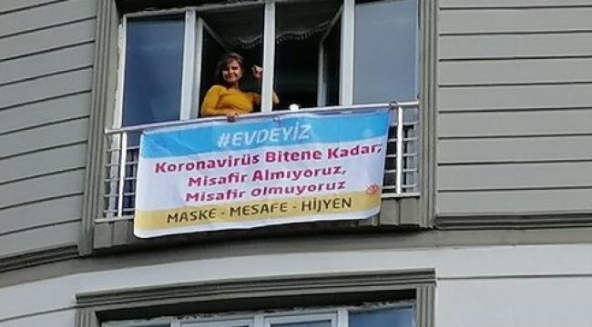 Sağlık Bakanı Fahrettin Koca’nın dün vaka artışı olan iller arasında Tokat’ı da sayması üzerine kentte yaşayan gönüllü turizm elçisi Fatma Esin Tuna, Karşıyaka Mahallesi'ndeki evinin camına, 'Evdeyiz, koronavirüs bitene kadar, misafir almıyoruz, misafir olmuyoruz, maske, mesafe, hijyen' yazılı afiş astı.