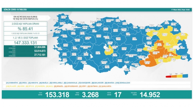 Sağlık Bakanlığı'nın açıkladığı 'Günlük Kovid- 19 Tablosu' verilerine göre; son 24 saatte yapılan 153 bin 318 testte 3 bin 268 vaka tespit edildi. Koronavirüs nedeniyle 17 kişi hayatını kaybederken, 14 bin 952 kişinin de tedavisi ve karantinası sona erdi. 18 yaş ve üzeri nüfusun aşılanması verilerinde 1'inci doz Türkiye ortalaması yüzde 93,13, 2'nci doz ortalaması yüzde 85,41 olarak belirlendi. Ayrıca 1'inci dozda 57 milyon 804 bin 686, 2'nci dozda 53 milyon 14 bin 873 ve 3'üncü dozda 27 milyon 712 bin 181 olmak üzere 147 milyon 333 bin 131 aşı uygulandı.