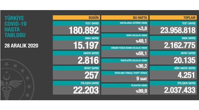 Sağlık Bakanlığının Covid-19 bilgilendirme sayfasında Türkiye'nin güncel korona virüs tablosu kamuoyuyla paylaşıldı. Tabloya göre son 24 saatte 257 kişi korona virüsten hayatını kaybetti, toplam can kaybı 20 bin 135'e yükseldi. Toplamda 23 milyon 958 bin 818 test yapıldı. Bugün yapılan 180 bin 892 testten 15 bin 197 yeni vaka sayısı, 2 bin 816 kişinin de hastaneye yatan vaka olduğu belirtildi. Toplam vaka sayısının 2 milyon 162 bin 775 olduğu, bugün iyileşen 22 bin 203 kişiyle birlikte toplam iyileşen hasta sayısının 2 milyon 37 bin 433'e yükseldiği, toplam hastalarda zatürre oranının yüzde 3,8, ağır hasta sayısının ise 4 bin 251 olduğu açıklandı.
