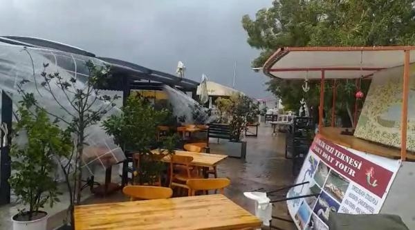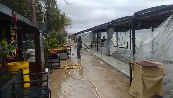 MUĞLA'nın Köyceğiz ilçesinde şiddetli yağış nedeniyle göl taştı, kordondaki iş yerlerinin masa ve sandalyeleri su altında kaldı.