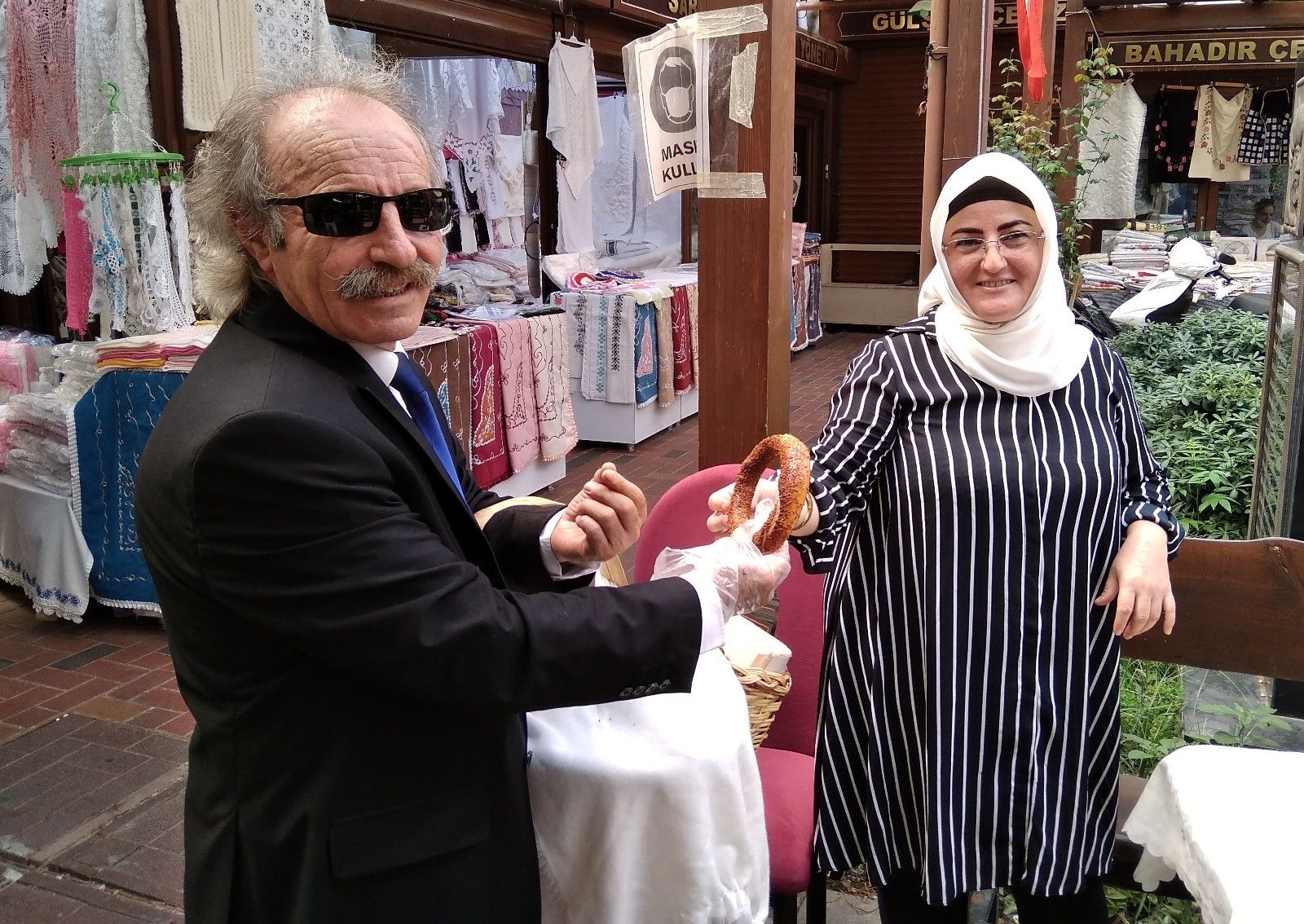 Bursa'da takım elbise giyip, kravat takarak seyyar simitçilik yapan vatandaş, talebe yetişemiyor.