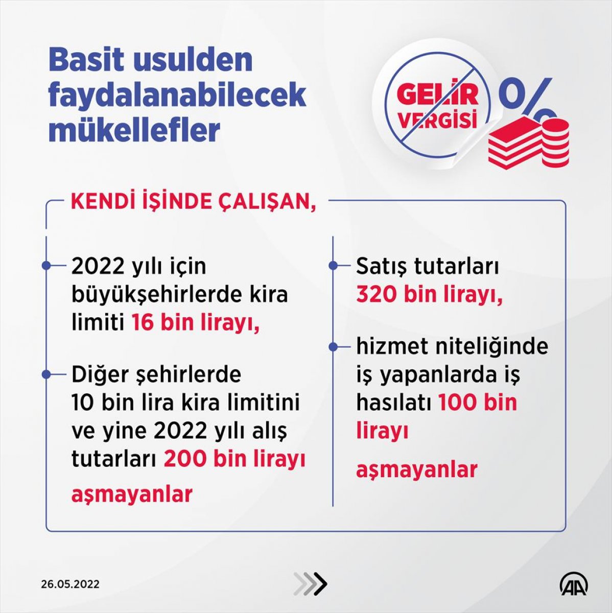 Buna göre, kendi işinde çalışan ve 2022 yılı için büyükşehirlerde 16 bin lira, diğer yerlerde 10 bin lira kira limitini aşmayan ve yine 2022 yılı alış tutarları 200 bin lirayı, satış tutarları 320 bin lirayı, hizmet niteliğinde iş yapanlarda iş hasılatı 100 bin lirayı aşmayan mükellefler basit usulden faydalanıyor.