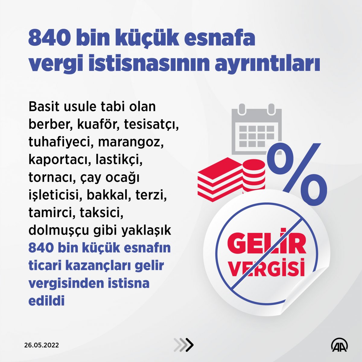 Basit usule tabi olan berber, kuaför, tesisatçı, tuhafiyeci, marangoz, kaportacı, lastikçi, tornacı, çay ocağı işleticisi, bakkal, terzi, tamirci, taksici, dolmuşçu gibi yaklaşık 840 bin küçük esnafın ticari kazançları gelir vergisinden istisna edildi.