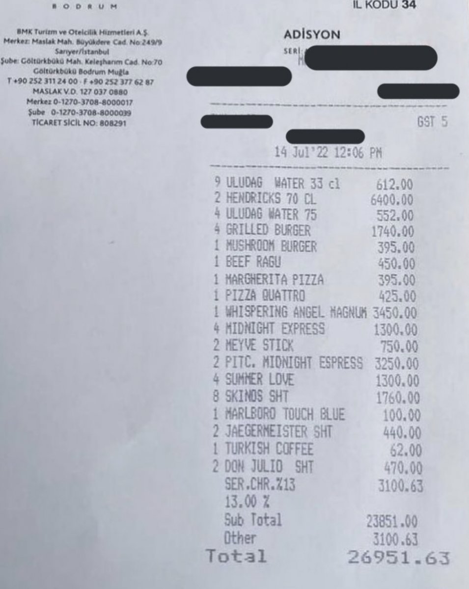 O adreslerden biri olan Bodrum'da tatil yapan bir tatilci de ödediği bir hesabın fotoğradını paylaştı. 26 bin 951 TL'lik adisyon görenleri hayrete düşürüdü.