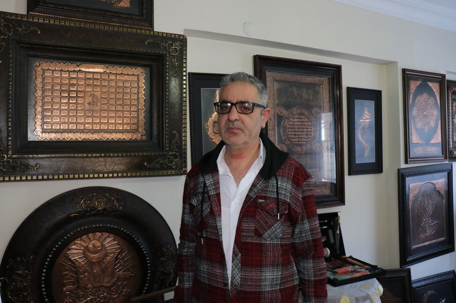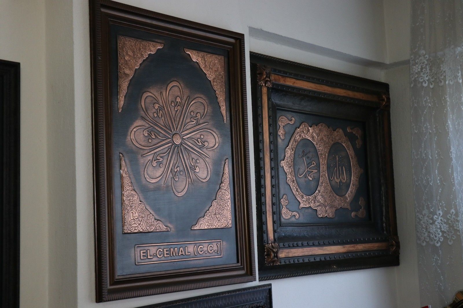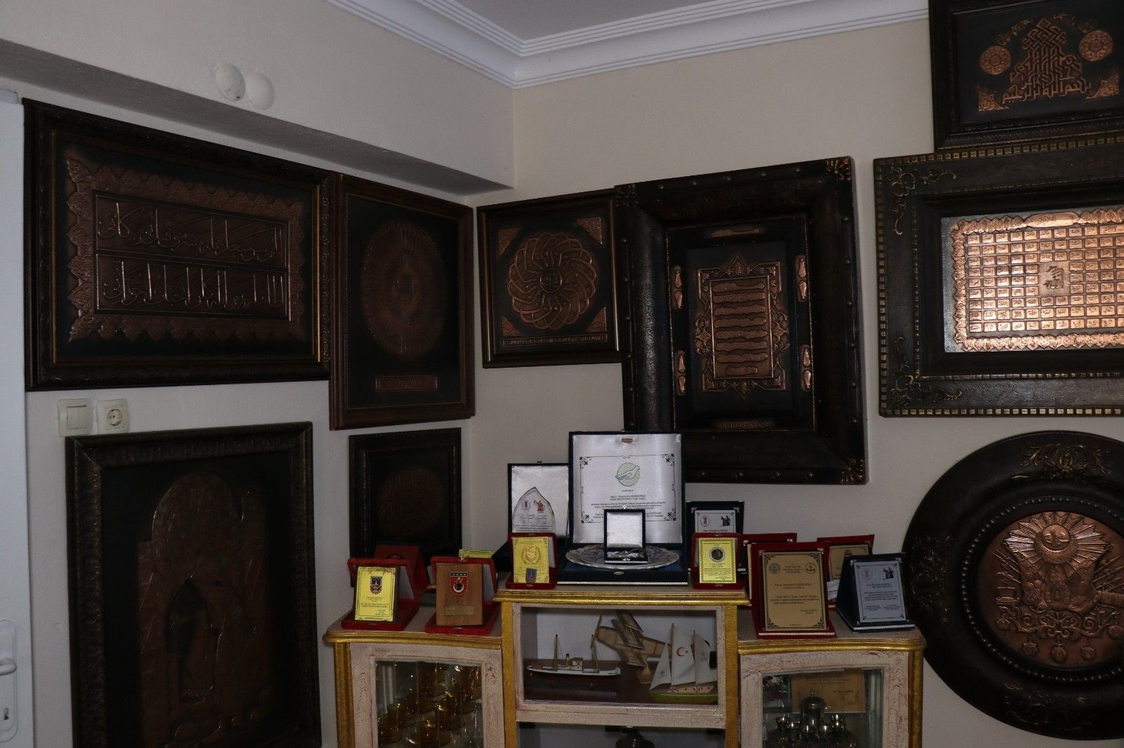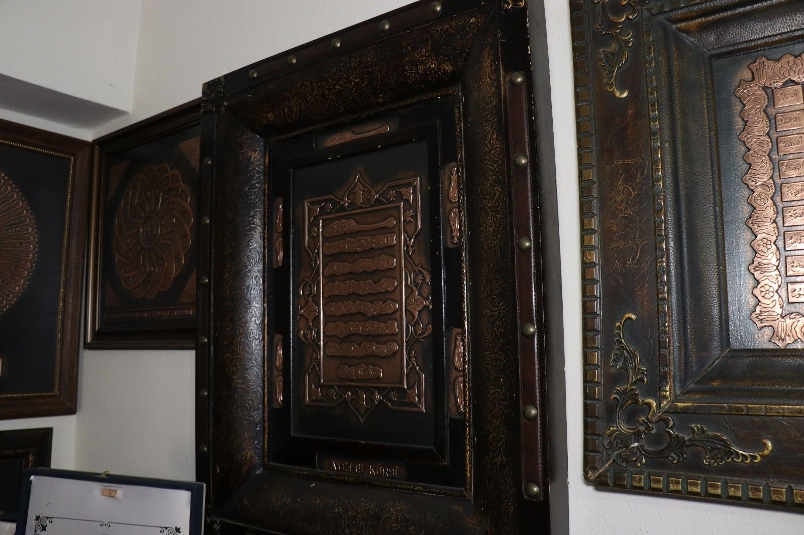 12 yıl önce hobi olarak başladığı sanatta ustalaşan ve katıldığı yarışmada 'Kültür Oscarı' ödülü kazanan Necmeddin Sadıkoğlu, "Yaklaşık 12 yıl önce hobi olarak başladım bu sanata. Daha sonra ticari olarak geri dönüşümleri oldu, kazanç sağlamaya başladık. Ama kazanç sağlamaya başladıktan sonra da sanatı tamamen kendimize indirgedik, geliştirdik. Önceden bakırı alıp çiz, kabart ve yapıştır aşamaları vardı. Biz bunu araştırdık tamamen sanatsal boyutuna geçtik ve ondan sonra baktık ki biz bunun hocası olmuşuz, kurslarını ve eğitimlerini veriyoruz. 2018 yılında İstanbul'da kültür ürünleri yarışmamız vardı ona hazırlandık Ayet-el Kürsi tablomuz ile birlikte. Bu tablo için yaklaşık 3-4 ay sürdü çalışmamız. İstanbul'a yarışmaya katıldık, bu yarışmada da Oscar ödülüne laik görüldük. Çerçeveleri de çok özel; altı ahşap, üstü deridir, içi bakır tamamen el işçiliği ile. Tablolardaki görülen siyahlık ise zırnık ile yakılan taraflarıdır" dedi.