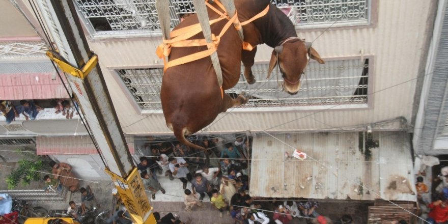 Kurbanlık sığırları çatıdan vinçle indirdiler