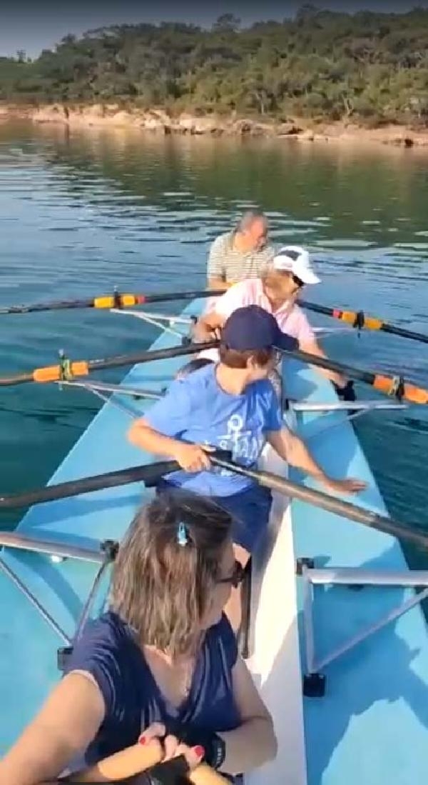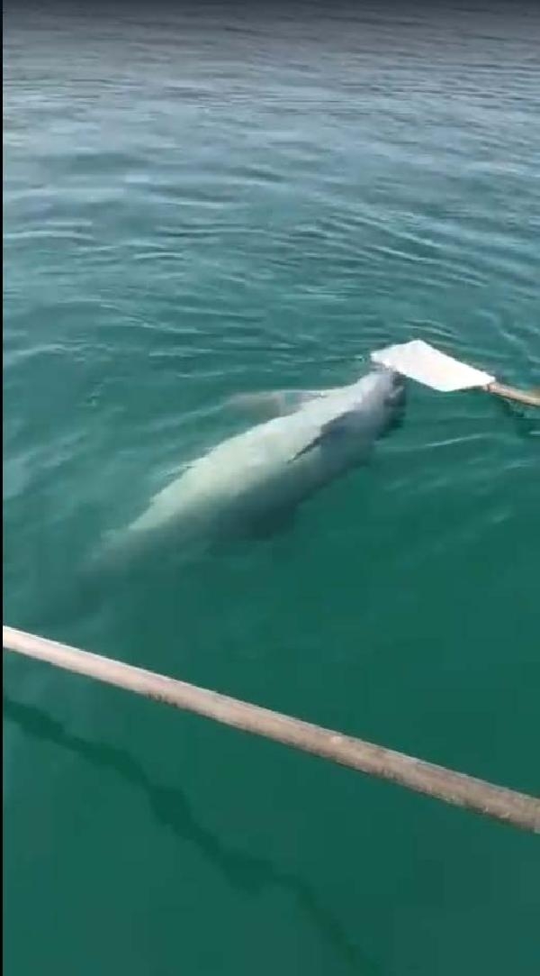 BALIKESİR'in Ayvalık ilçesinde denize açılan kürek sporcularının teknesinin yanına gelen yunusun başıyla küreklere vurduğu anlar, kamerayla görüntülendi.