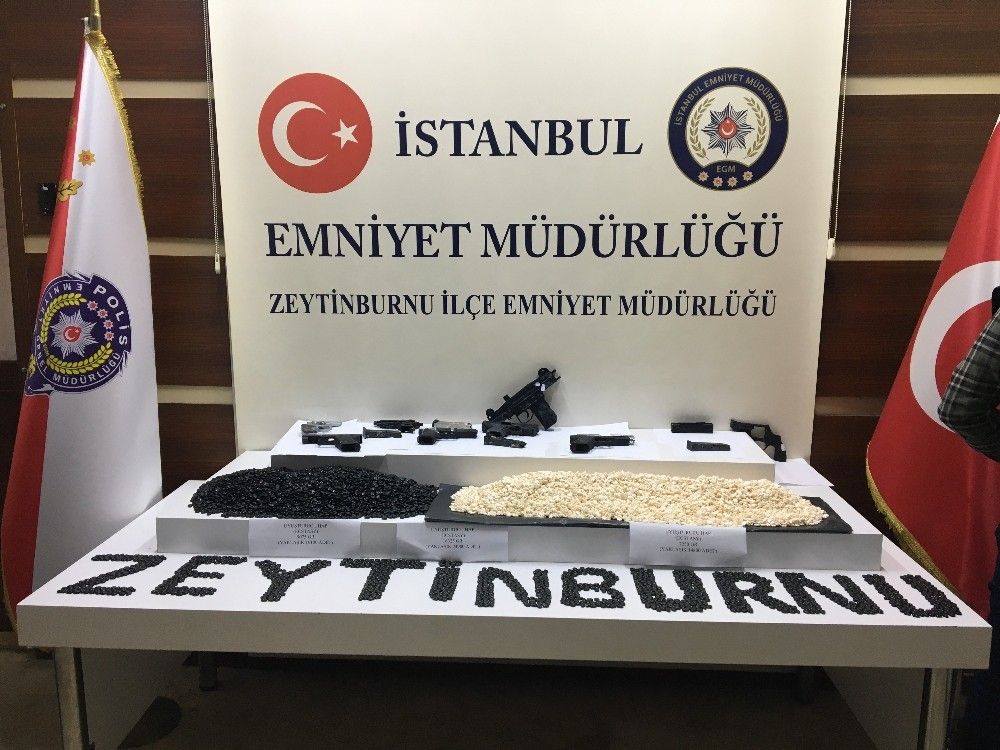 Zeytinburnu Güvenlik Büro Amirliği'ne bağlı ekiplerin gerçekleştirdiği çalışmalar sonucunda Çırpıcı Mahallesi'nde bulunan metruk bir binada uyuşturucu hap ve çok sayıda silah parçası olduğu tespit edildi. Bina içinde kontrollerini gerçekleştiren ekipler 10 bin 100 adet "Kuru kafa" baskılı ve 14 bin 800 adet kar tanesi şeklinde uyuşturucu hap ele geçirdi.