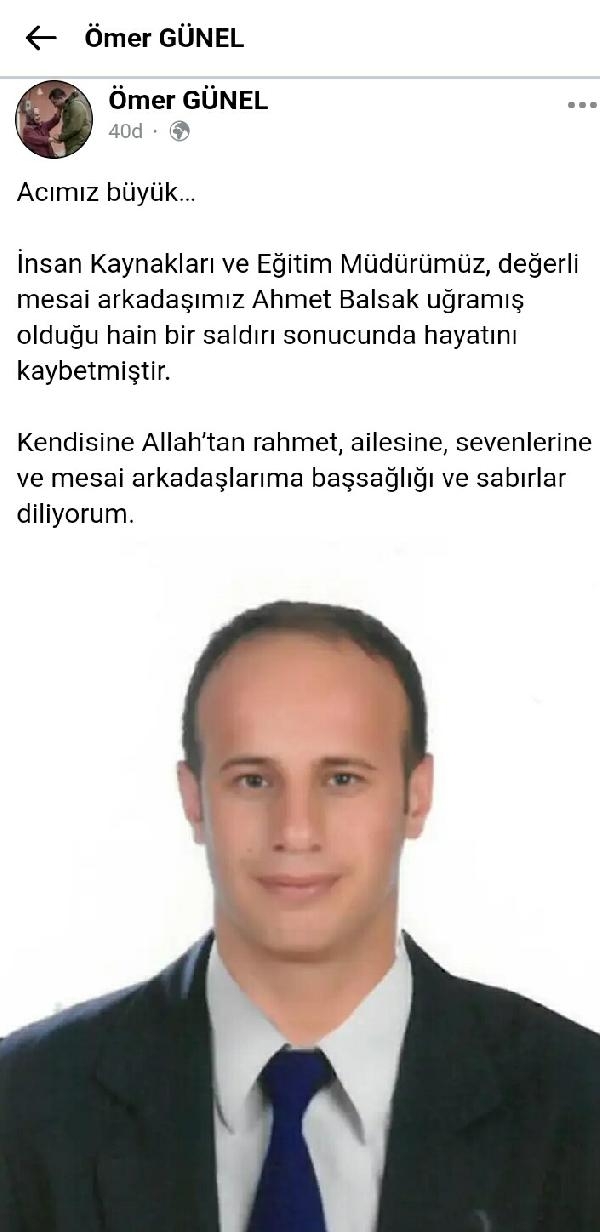 "Acımız büyük… İnsan Kaynakları ve Eğitim Müdürümüz, değerli mesai arkadaşımız Ahmet Balsak uğramış olduğu hain bir saldırı sonucunda hayatını kaybetmiştir. Kendisine Allah'tan rahmet, ailesine, sevenlerine ve mesai arkadaşlarıma başsağlığı ve sabırlar diliyorum." (DHA)