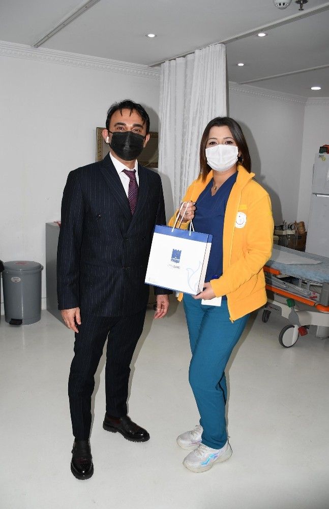 Kuşadası Belediyesi yeni yıla girerken kentteki sağlık çalışanlarını unutmadı. Belediye Başkan Vekili Tibet Özer, Kuşadası'nda bulunan sağlık kuruluşlarını ziyaret ederek çalışanların yeni yılını kutladı. Başkan Vekili Tibet Özer, korona virüs pandemisi ile mücadelenin kahramanları olan sağlık çalışanlarına içerisinde dijital-akıllı masaüstü saat ve Kuşadası Belediye Başkanı Ömer Günel'in yeni yıl kutlamasının yer aldığı hediye paketlerini vererek emekleri ve fedakarlıkları için teşekkür etti.