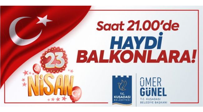 Kuşadası Belediye Başkanı Ömer Günel, 23 Nisan Ulusal Egemenlik ve Çocuk Bayramı'nı bu yıl da pandemi nedeniyle evlerde kutlamak zorunda kaldıklarını belirterek, "Ancak bu durum coşkumuza engel teşkil etmiyor. 23 Nisan'ın neşesi ve heyecanı gün boyunca kentimizin tüm cadde ve sokaklarında yaşanacak. Çocuklarımız ise evlerinden ve balkonlarından bu coşkuya eşlik edecek. Tüm hemşehrilerimizi saat 21.00'de balkonlarına çıkarak hep bir ağızdan İstiklal Marşımızı okumaya davet ediyor, sağlıklı, güzel günlerde yeniden bir arada olma dileğiyle 23 Nisan Ulusal Egemenlik ve Çocuk Bayramını kutluyorum" dedi.