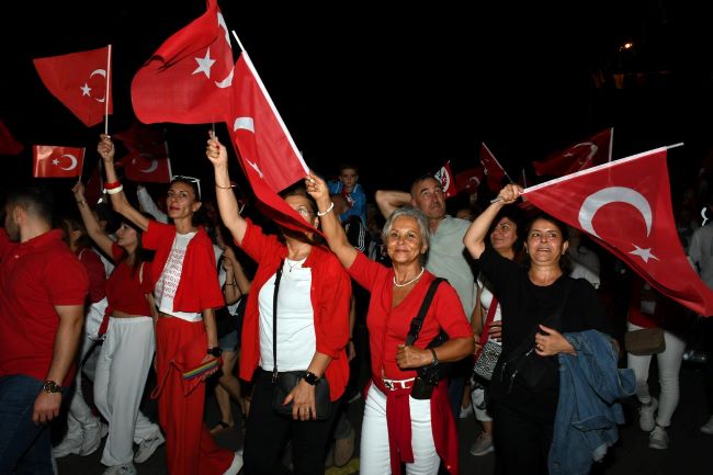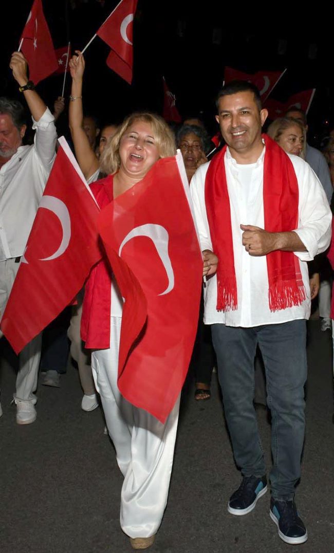 Yürüyüşte vatandaşlar ellerinde Türk Bayrağı, Atatürk posterleri ve meşaleler taşıyarak hep bir ağızdan marşlar söyledi. Atatürk Bulvarı üzerinden Kuşadası Belediyesi Hizmet Binası’na yürüyen korteje Belediye Başkanı Ömer Günel ailesi ile birlikte eşlik etti.
