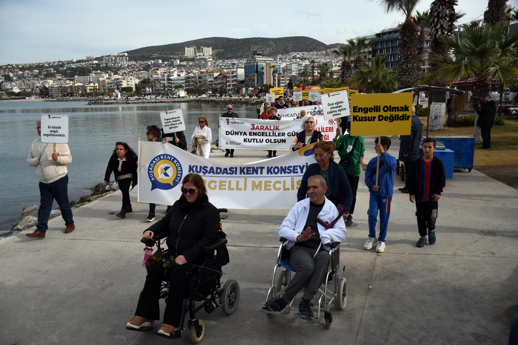 Kuşadası’nda '3 Aralık Dünya Engelliler Günü' kutlandı. Kuşadası Belediyesi’nin verdiği destekle düzenlenen kutlama programında, kentteki sivil toplum kuruluşlarının katılımıyla kortej düzenlenip, Atatürk Anıtı’na çelenk sunuldu.