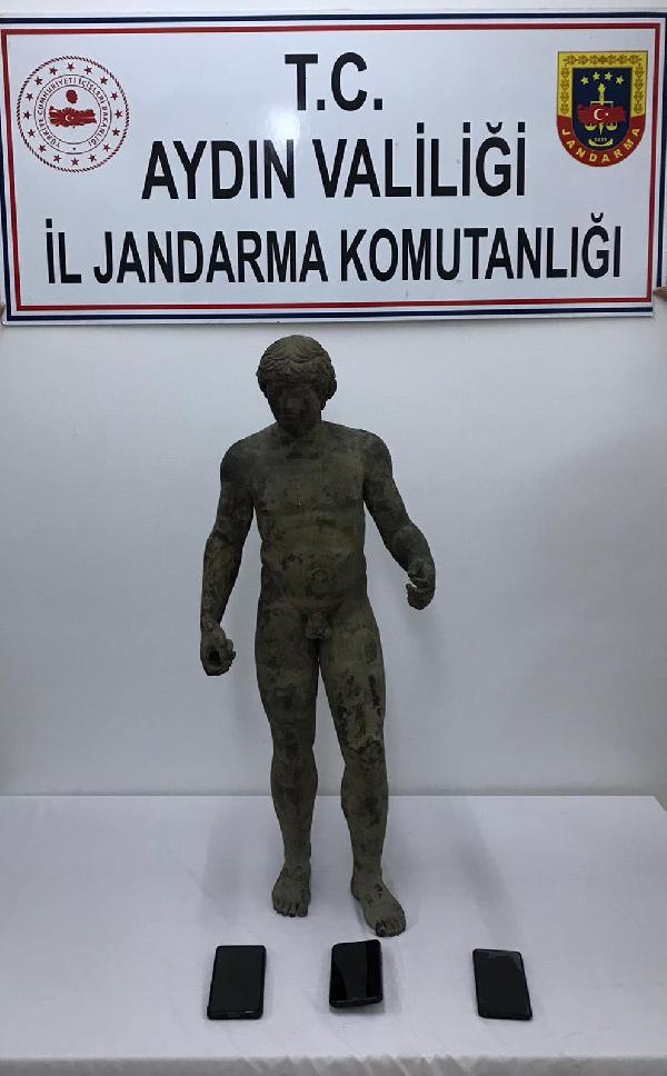 AYDIN'ın Kuşadası ilçesinde jandarmanın düzenlediği tarihi eser operasyonunda Roma dönemine ait olduğu belirlenen bronz erkek heykeli ele geçirilirken, 3 kişi gözaltına alındı.