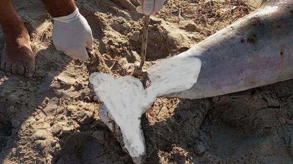 Aydın Kuşadası'nın Karaova sahili Düşler Yakası Plajı'nda yürüyüş yapanlar dün kıyıda hareketsiz bir yunus olduğunu fark edip durumu EKODOSD'a bildirdi. İhbar üzerine EKODOSD Başkanı Bahattin Sürücü ve beraberindekiler bölgeye gidip, inceleme yaptı. İncelemede, kuyruğuna bağlı olan ipten ve deri yüzeyindeki sürtünmeden dolayı oluşan tahribat nedeniyle ağlardan çıkarılarak tekneden denize bırakıldığı belirlendi. Kıyıya vuran yunusun, nesli küresel ölçekte tehlike altında olan 'Tırtak' türü yunus olduğu belirlendi. 2 metre 5 santim boyundaki yunusa nekropsi yapılmadığını dile getiren Sürücü, "Hedef dışı av olarak ağlara takılarak boğulduğunu düşünüyoruz. Kuyruğuna bağlı olan ipten ve deri yüzeyindeki sürtünmeden dolayı oluşan tahribattan, ağlardan çıkarılan yunusun tekneden denize bırakıldığı anlaşılıyor. Denizde rüzgar ve dalgaların etkisiyle kıyıya kadar sürüklendiği görülüyor. Yunustaki aşırı bozulma nedeniyle nekropsi yapılamadı" ifadelerini kullandı.