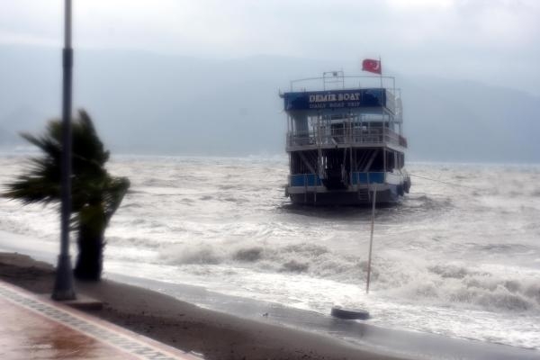 MUĞLA'nın Marmaris ilçesinde, saatteki hızı 40 kilometreyi bulan kuvvetli rüzgar nedeniyle vatandaşlar yolda yürümekte güçlük çekti, günübirlik bir gezi teknesi sürüklenerek karaya oturdu.