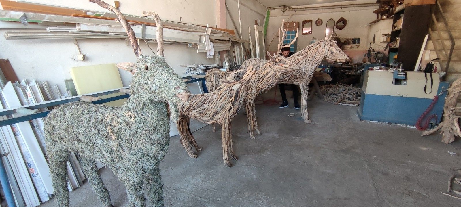 Antalya'nın Gazipaşa ilçesinde 15 yıldır plastik doğrama ustası olarak çalışan Mustafa Duygu, lodosun sürüklediği dalları hayvan heykellerine dönüştürüyor.
