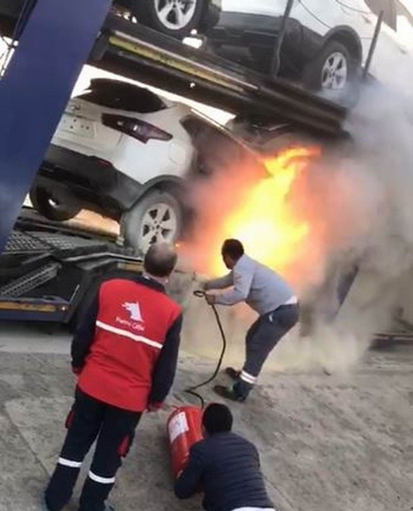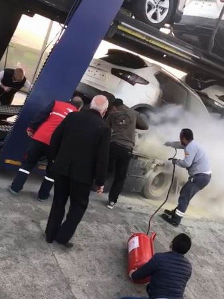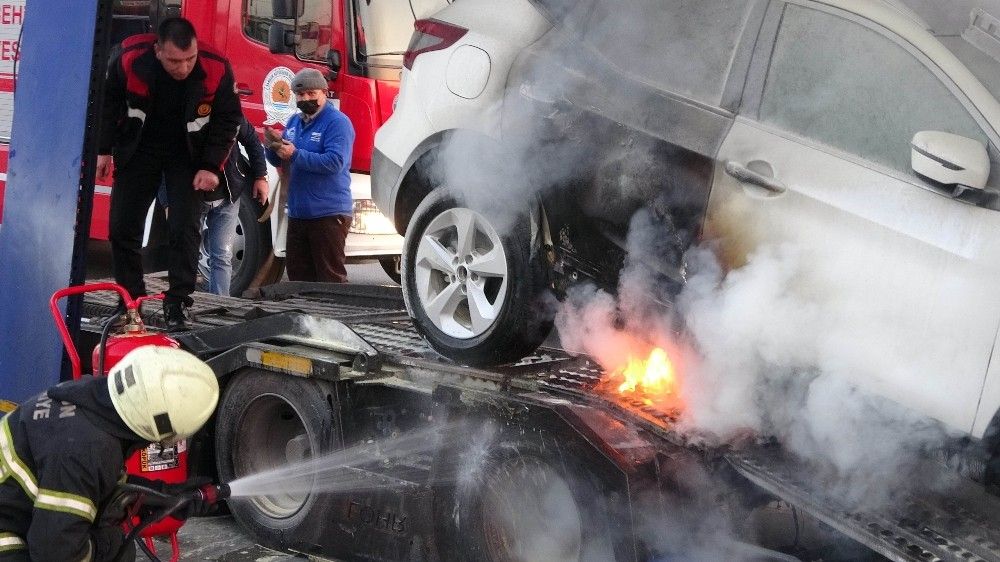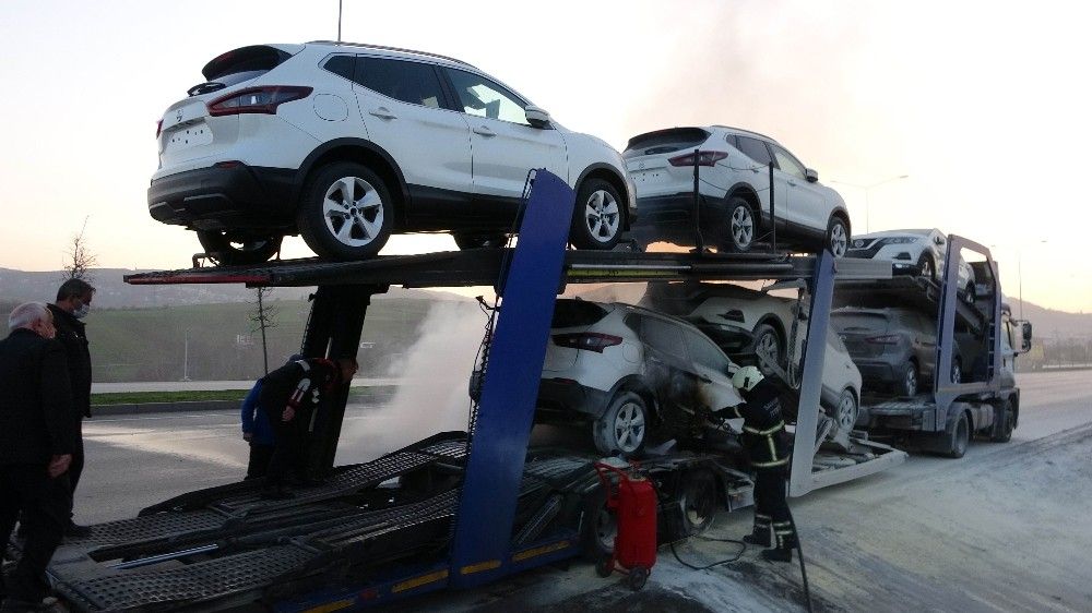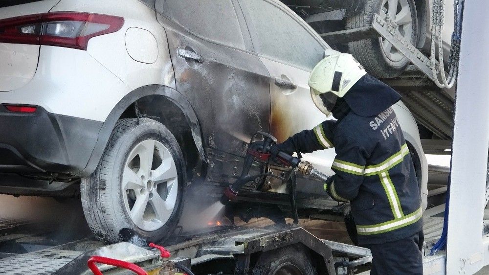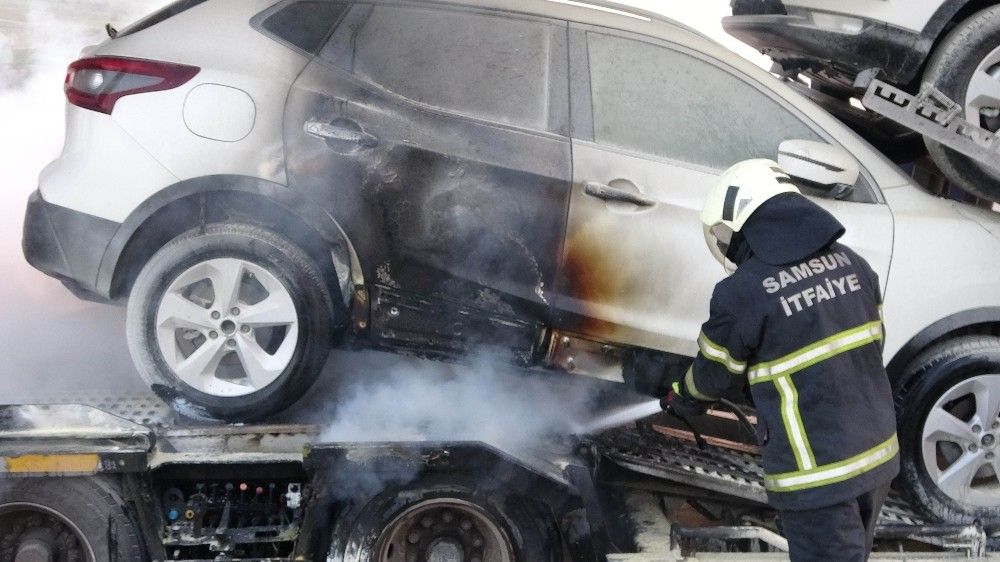 Samsun'da fabrikadan bayilere sıfır araç taşıyan tırda yangın çıktı. Yangına vatandaşlar anında müdahale edince, tır ve üzerindeki 7 otomobil yanmaktan son anda kurtarıldı.